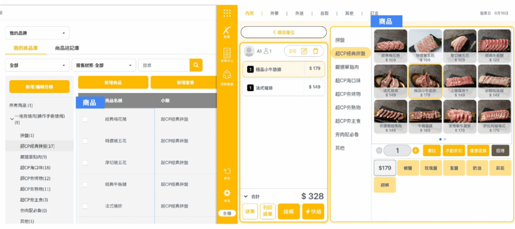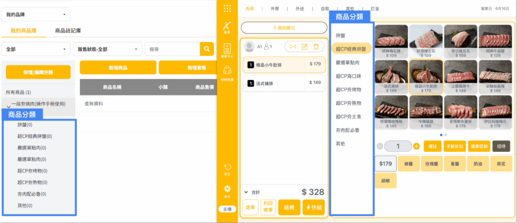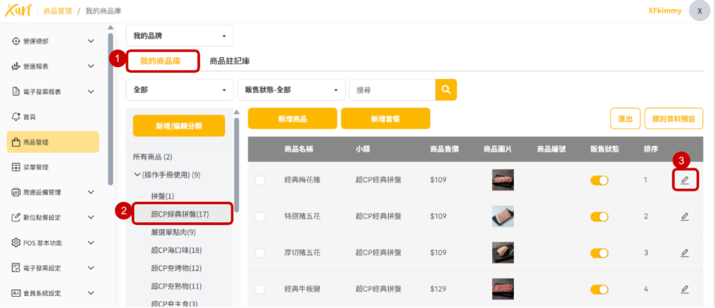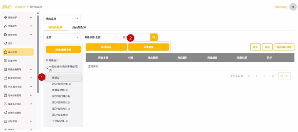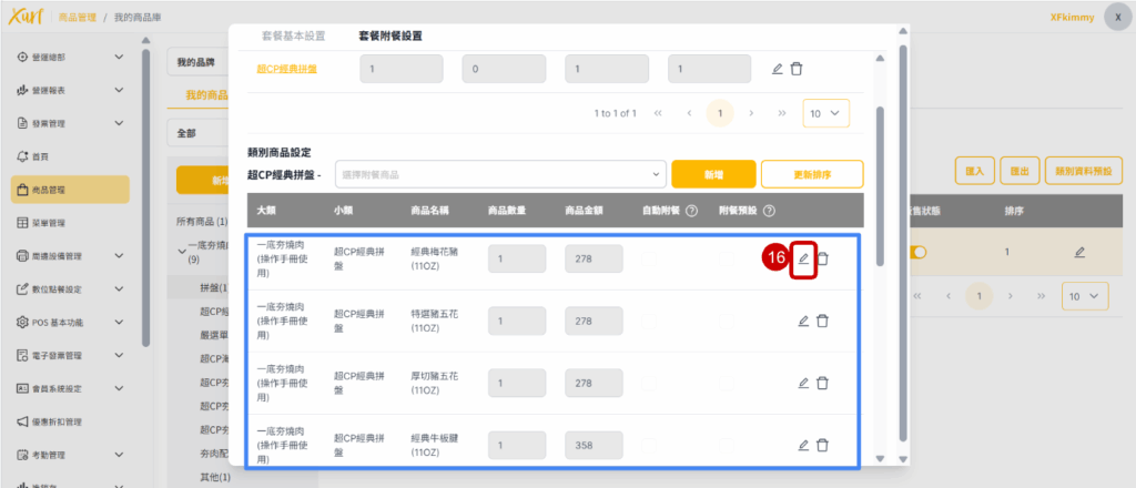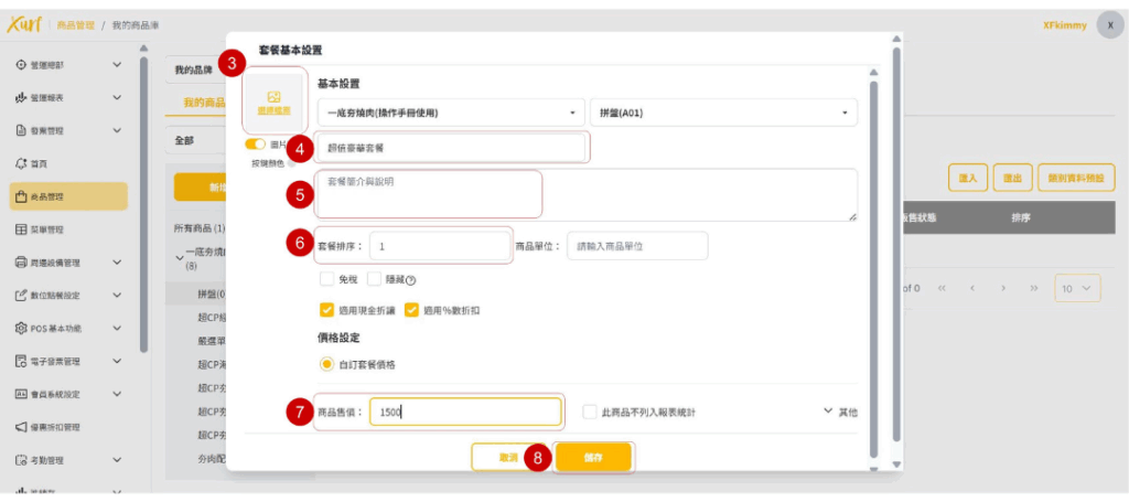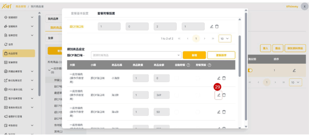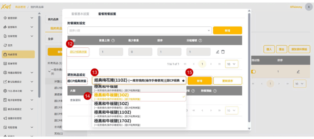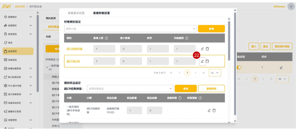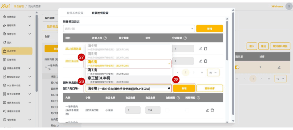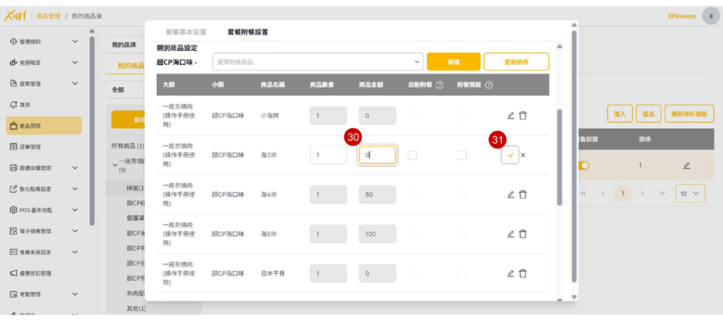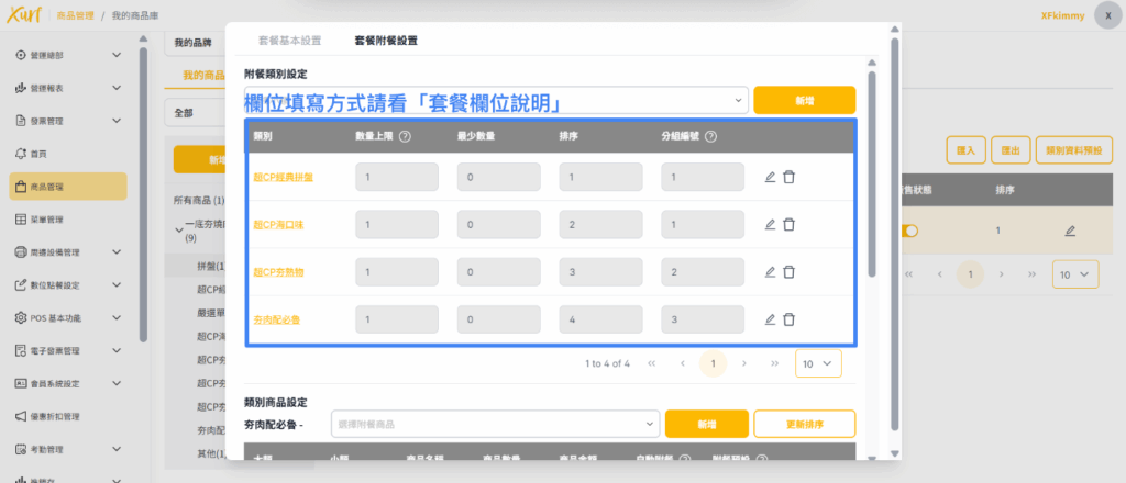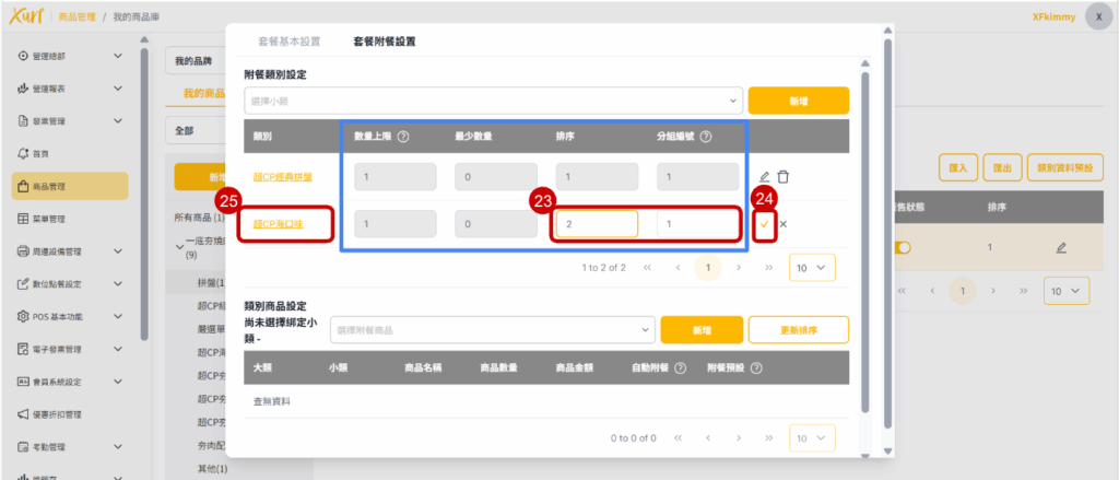 ★ 重複19~31的步驟新增各「類別」及套餐可選擇之「商品」,並依套餐架構需求編輯「數量上限、排序、分組編號」