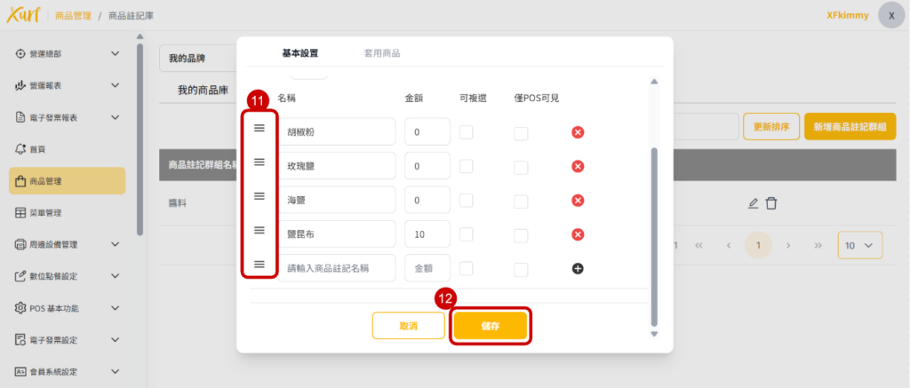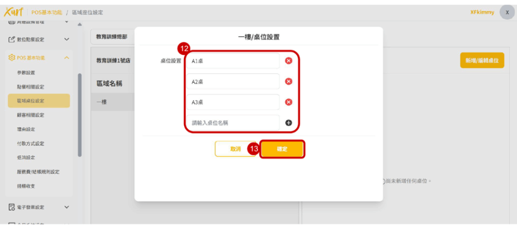 12. 輸入「桌號名稱」,可點選「+」「x」新增或刪除桌位