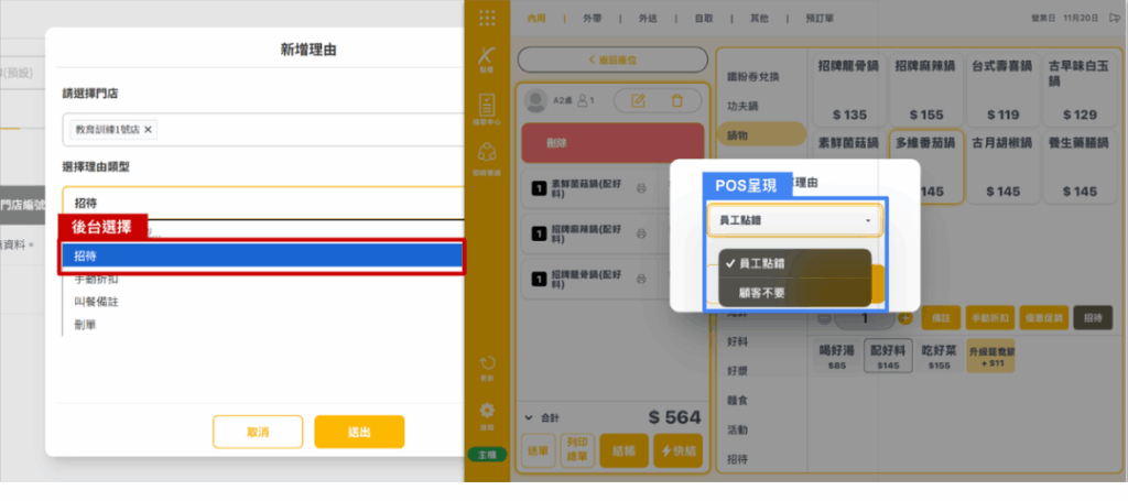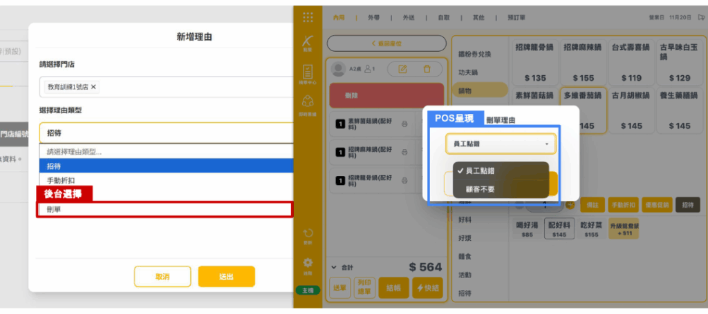 ★ 理由類型中有「刪單理由」在POS機顯示的畫面
