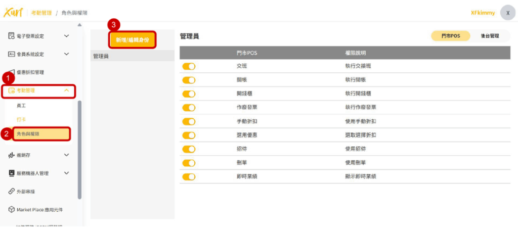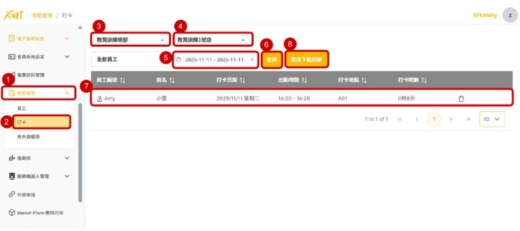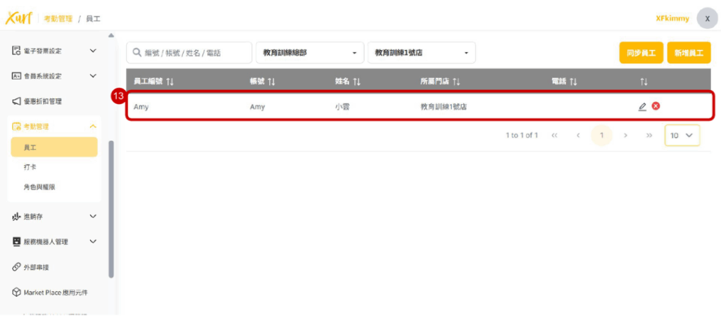 13. 新增完成後即呈現該員工資訊並可在POS機操作打卡