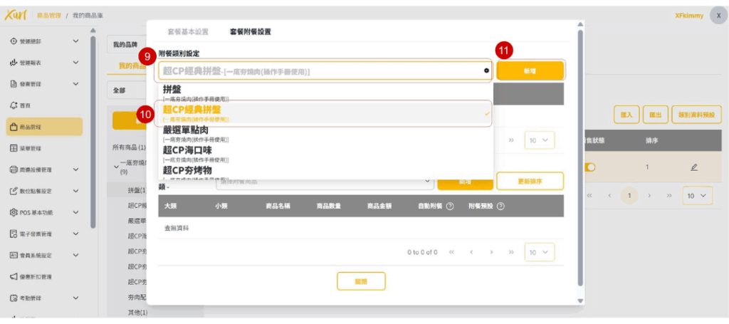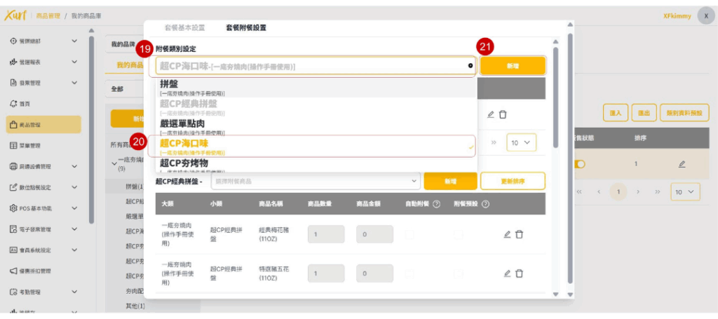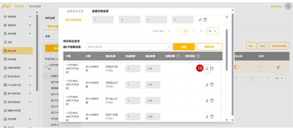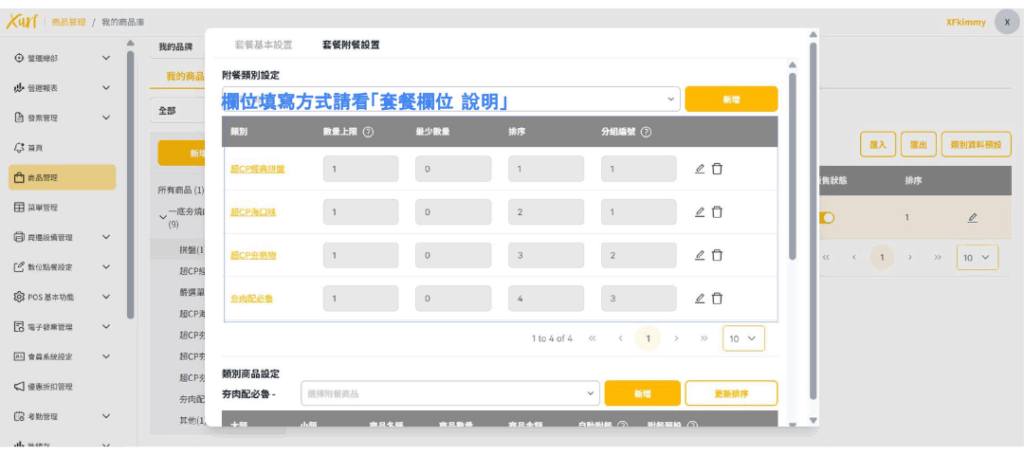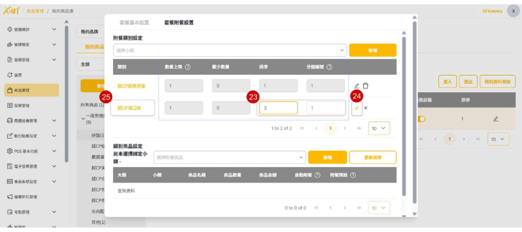 ★ 重複19~31的步驟新增各「 類別 」及套餐可選擇之「 商品 」,並依套餐架構需求編輯「 數量上限、排序、分組編號 」